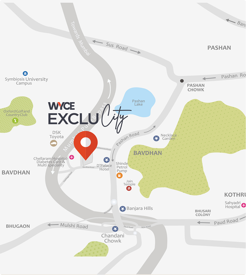 Experience a refined modern lifestyle across an impressive, premium high-rise township located in Central Bavdhan, Pune. WYCE Exclucity is crafted with thoughtful planning, world-class amenities, and timeless architecture that elevates your everyday living. The project brings together elegance, comfort, and convenience for families looking for premium homes in a rapidly developing residential hub.